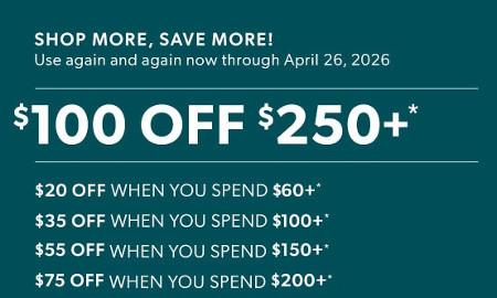 Buy more, save more! Shop in store and get up to $100 off when you spend $250+.